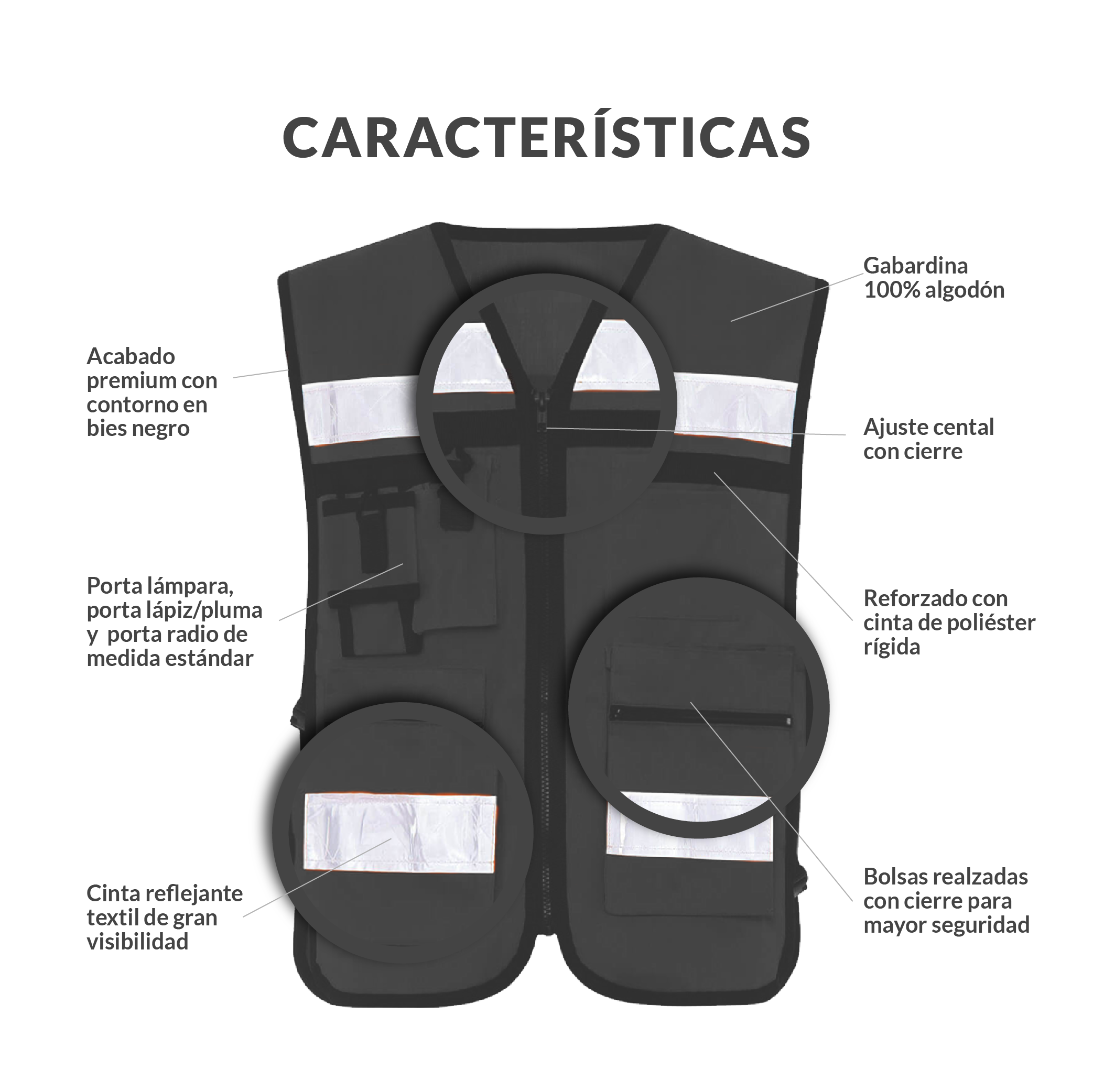 Acabado premium con contorno en bies negro que prolonga el tiempo de vida del chaleco. Sus cintas reflejantes tipo cristal en la parte frontal y trasera brindan mayor visibilidad.