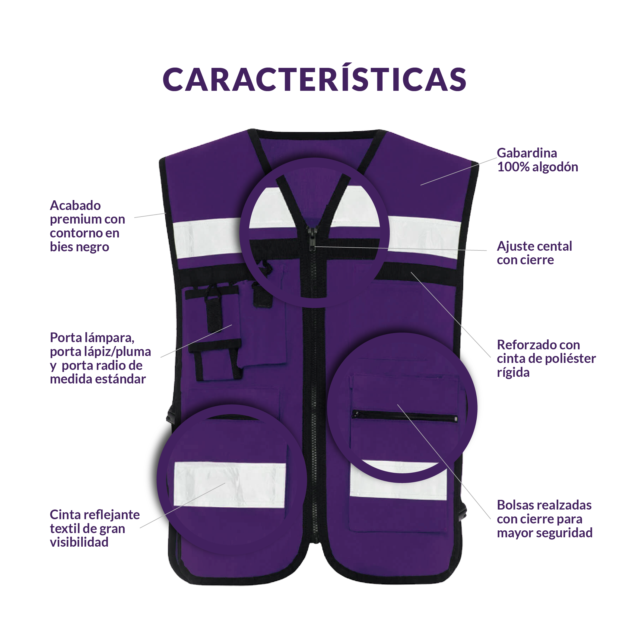 Acabado premium con contorno en bies negro que prolonga el tiempo de vida del chaleco. Sus cintas reflejantes tipo cristal en la parte frontal y trasera brindan mayor visibilidad.