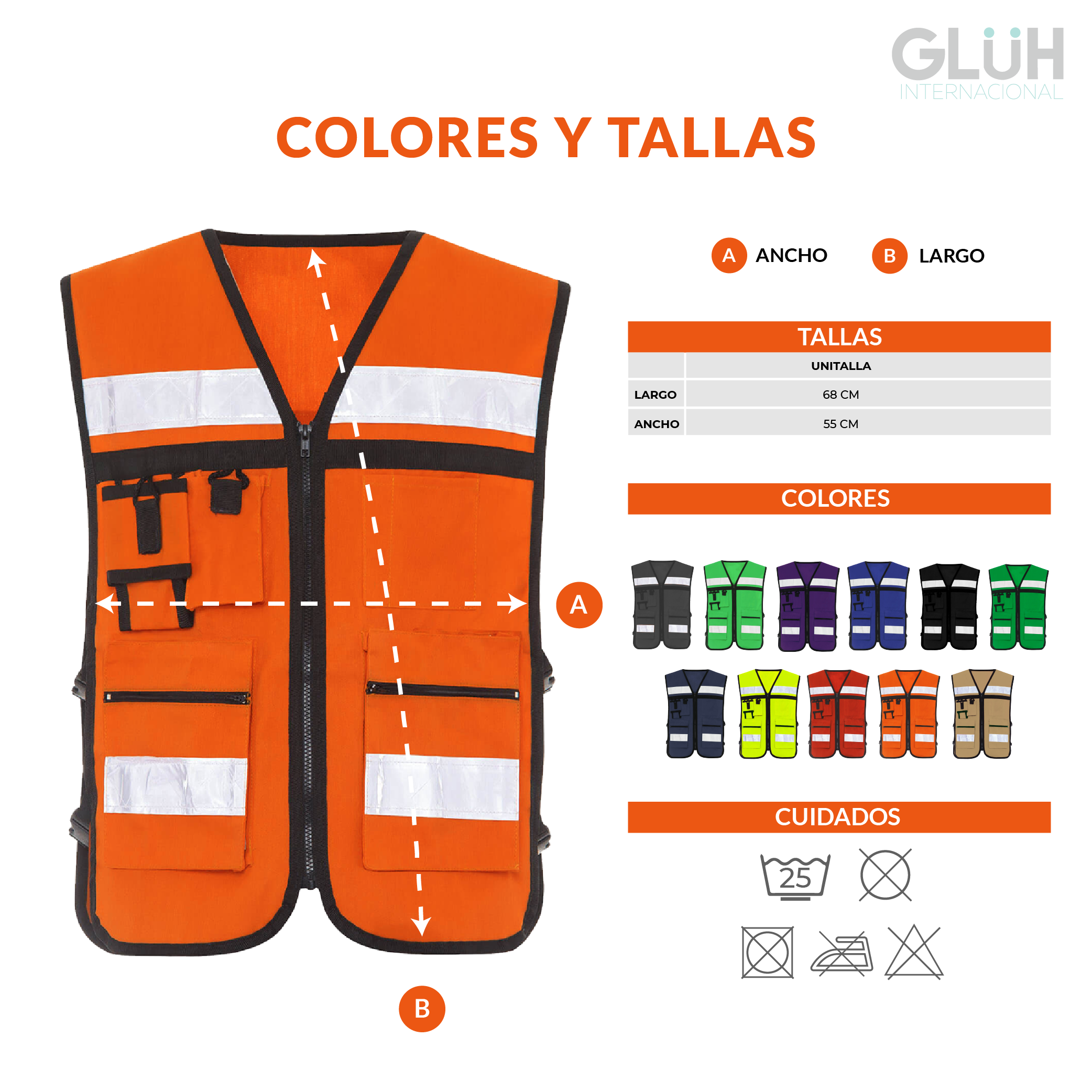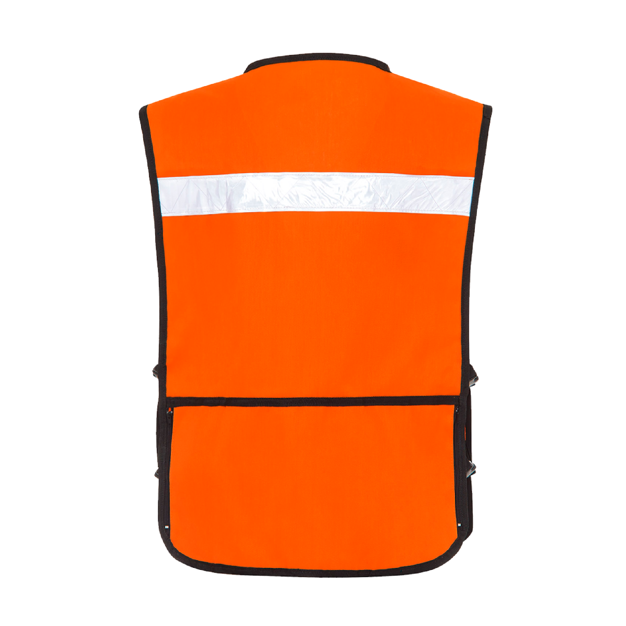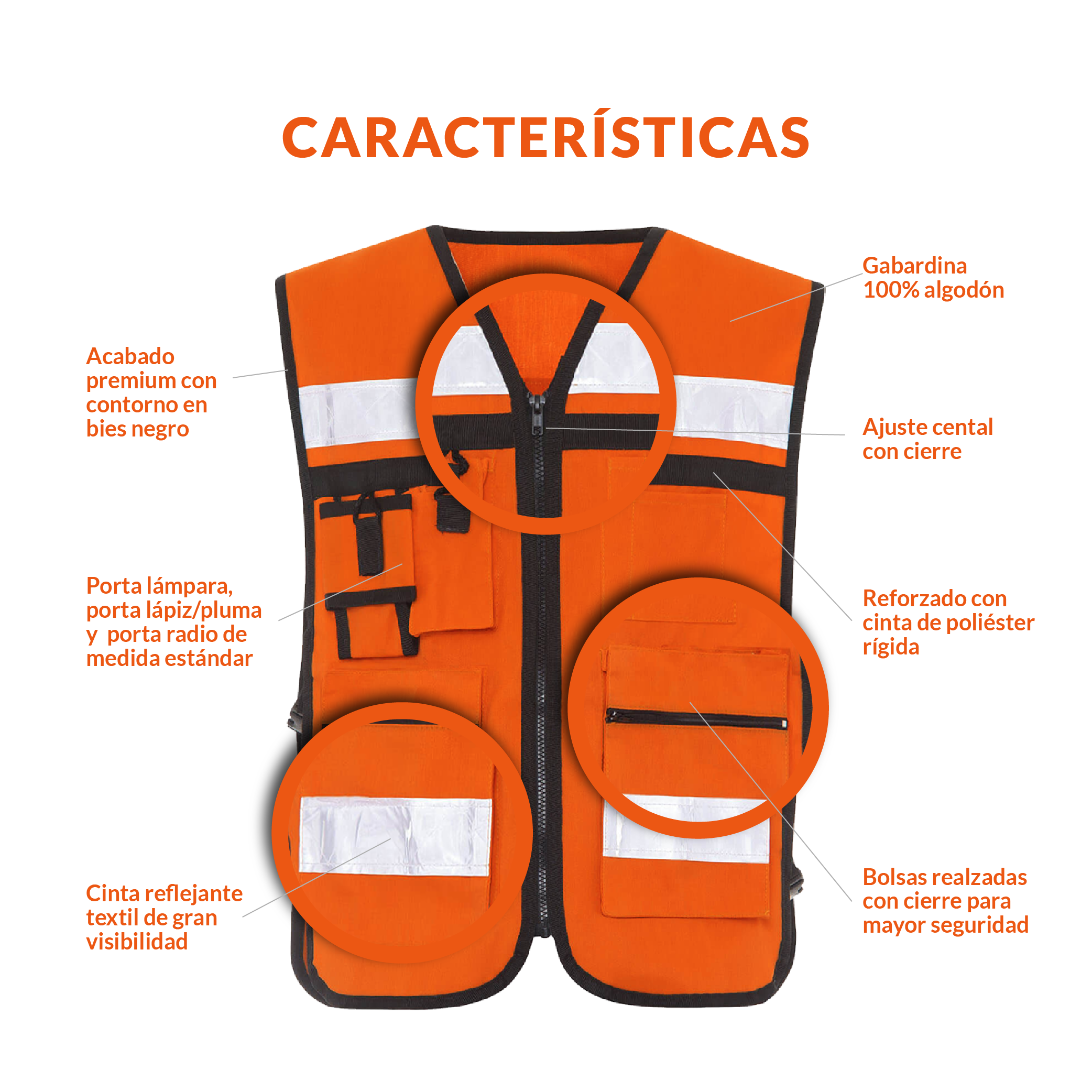 Acabado premium con contorno en bies negro que prolonga el tiempo de vida del chaleco. Sus cintas reflejantes tipo cristal en la parte frontal y trasera brindan mayor visibilidad.