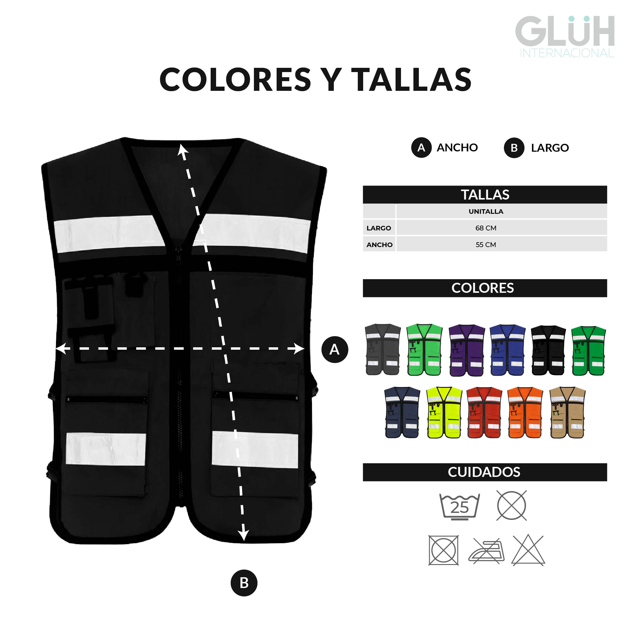 Acabado premium con contorno en bies negro que prolonga el tiempo de vida del chaleco. Sus cintas reflejantes tipo cristal en la parte frontal y trasera brindan mayor visibilidad.