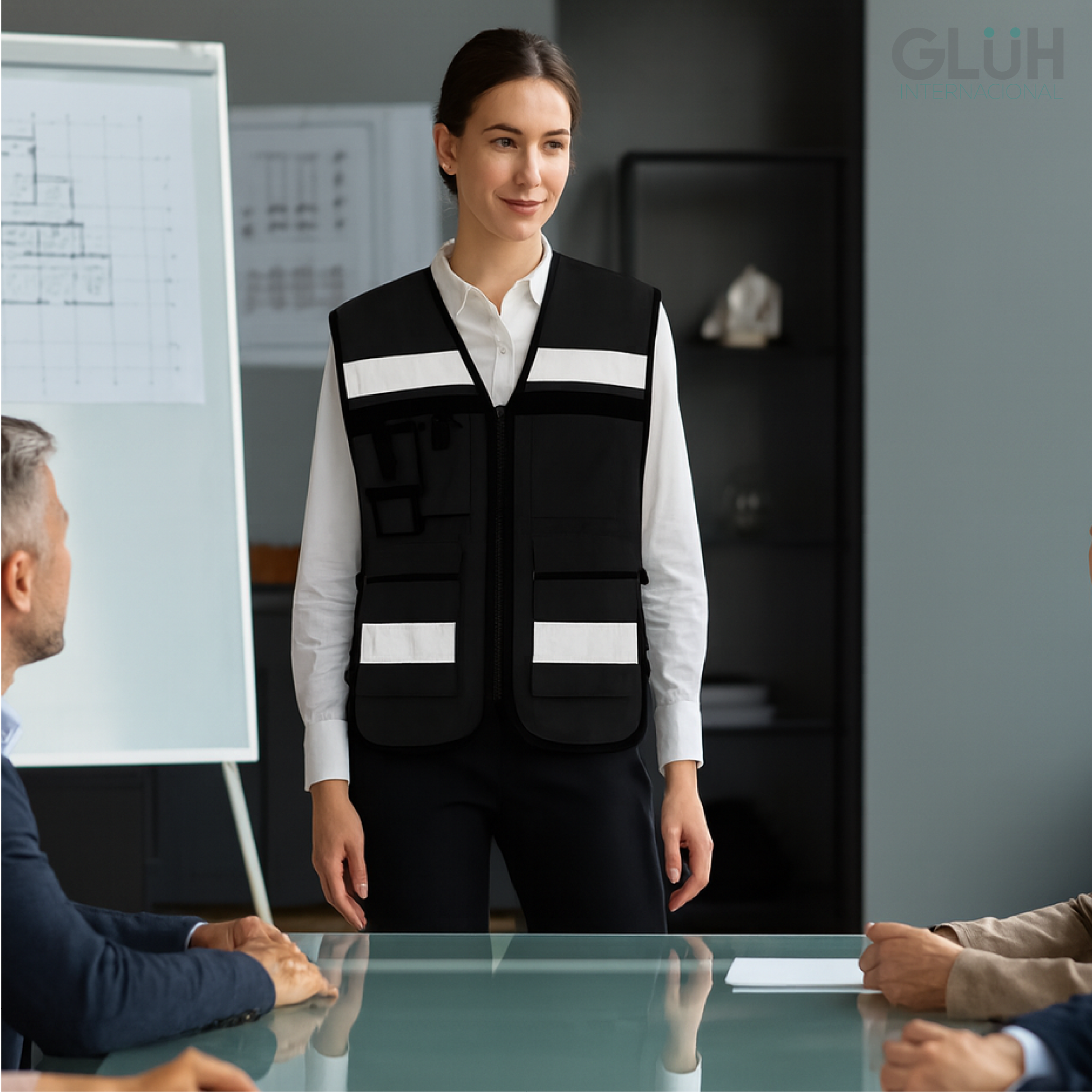 Chaleco de seguridad tipo brigadista hecho de gabardina 100% algodón, con ajuste central con cierre y ajustes laterales a medida.