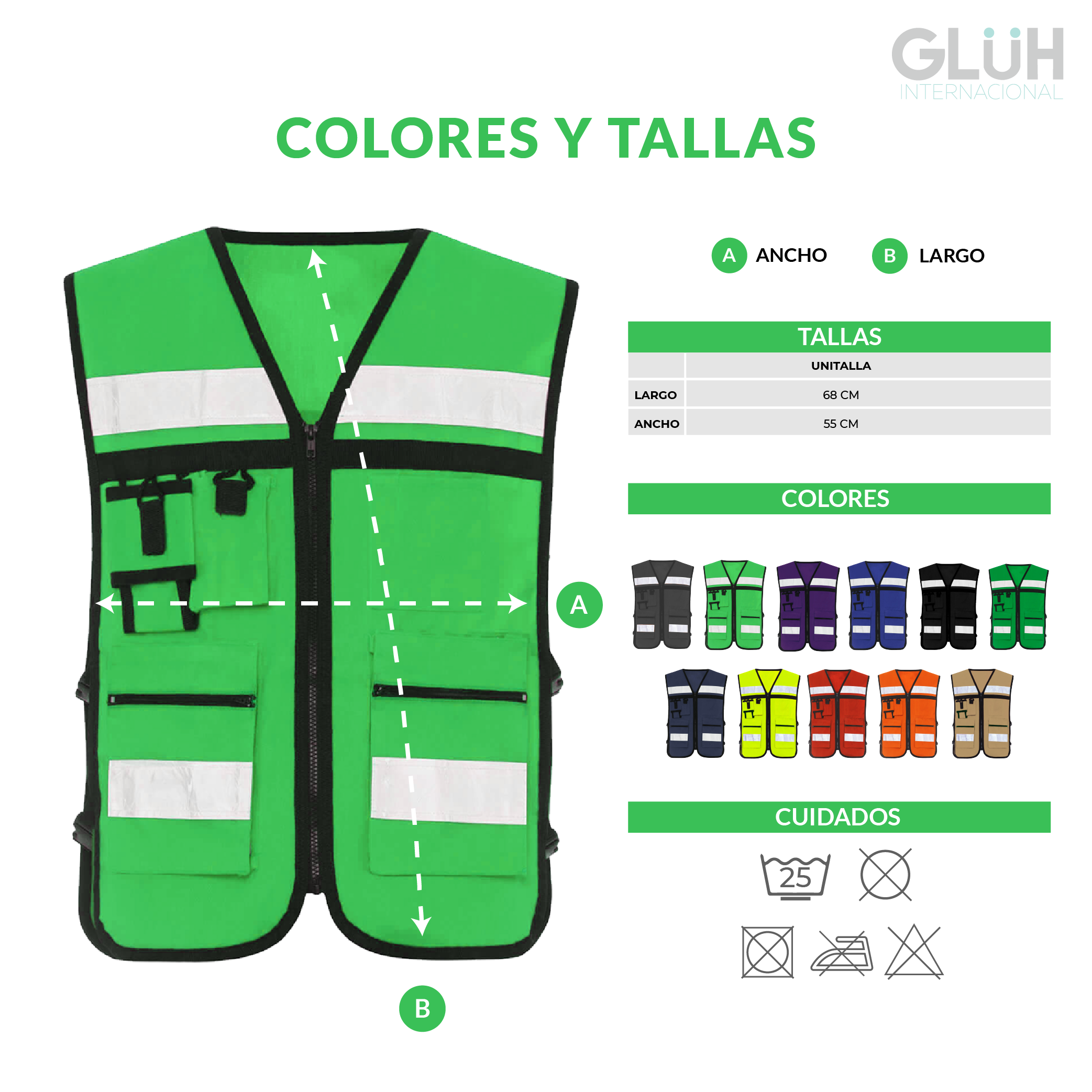 Acabado premium con contorno en bies negro que prolonga el tiempo de vida del chaleco. Sus cintas reflejantes tipo cristal en la parte frontal y trasera brindan mayor visibilidad.