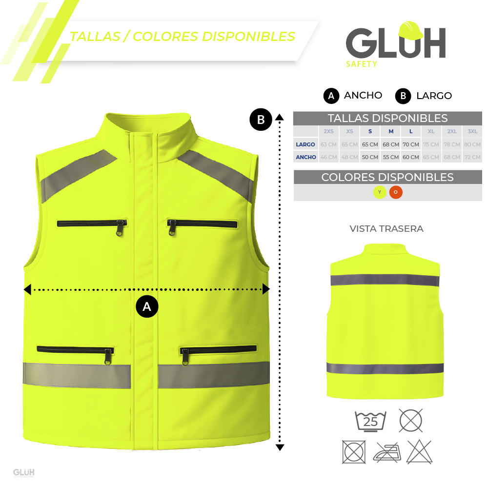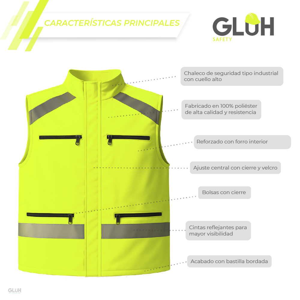 Chaleco de seguridad hecho de poliéster 100%, de cuello alto, con cierre central y velcro para un mejor cierre. Cuenta con forro interno ya cabado premium con bastilla bordada que prolonga el tiempo de vida del chaleco. Sus cintas reflejantes en la parte frontal y trasera brindan mayor visibilidad. Cuenta con 4 bolsas con cierre en la parte frontal.