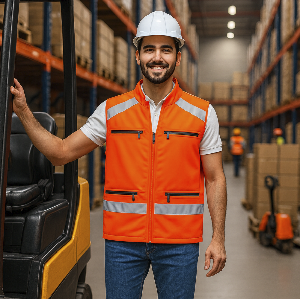 Chaleco de seguridad hecho de poliéster 100%, de cuello alto, con cierre central y velcro para un mejor cierre. Cuenta con forro interno ya cabado premium con bastilla bordada que prolonga el tiempo de vida del chaleco. Sus cintas reflejantes en la parte frontal y trasera brindan mayor visibilidad. Cuenta con 4 bolsas con cierre en la parte frontal.