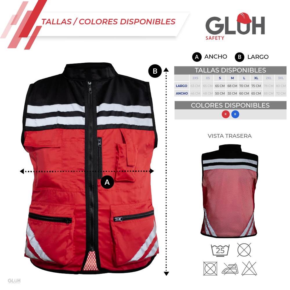 El chaleco de seguridad reflejante tipo brigadista Spark Gluh combina alta visibilidad, resistencia y funcionalidad para entornos laborales exigentes. Su diseño en gabardina con malla trasera ofrece transpirabilidad, mientras que sus cintas tipo Reflex brindan seguridad tanto de día como de noche.